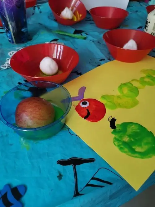 Start with a few cotton balls. Dip one into green paint and stamp it onto paper for the caterpillar’s body. Take another cotton ball, dip it into red paint, and stamp the head. Finish by adding an eye sticker or drawing one on, then use purple to create antennae. For extra fun, cut an apple in half, dip it in paint, and stamp it onto the paper so the caterpillar has something to nibble on.