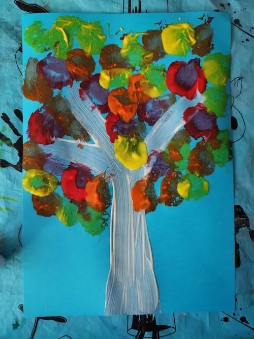 Next, prepare three small paint pots with yellow, red, and orange. Place a cotton ball in each color. Show your toddler how to dab the cotton balls around the branches to make bright autumn leaves. The finished picture looks beautiful, and the dabbing action makes it really fun for little hands.