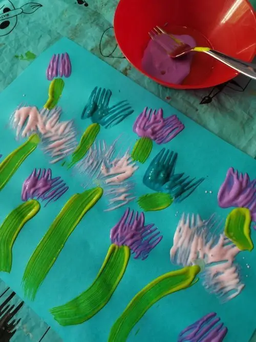 This one could not be easier, and the results are so pretty. Pour out some brightly colored paints, then hand your toddler a fork to use as a stamp. Pressing the fork onto the paper creates flower shapes instantly.