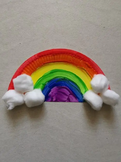 When the rainbow is complete, glue cotton balls at each end so they look like fluffy clouds. This is a cheerful activity that little ones love, and it makes a pretty decoration to hang up afterward.