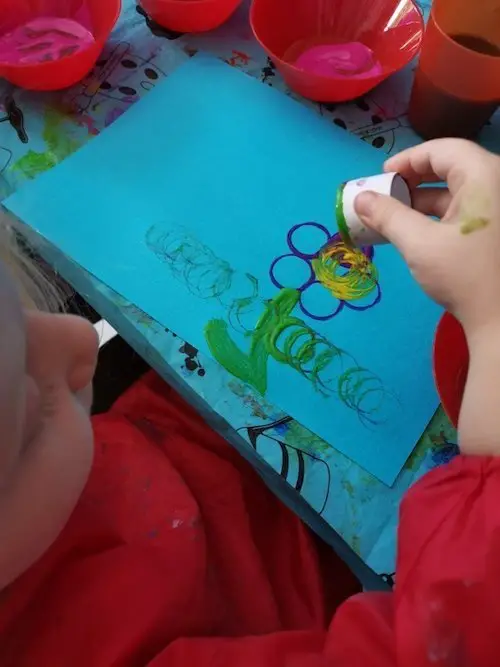 When they are done stamping, you can paint green stalks to finish off the flowers or encourage your toddler to add them. It makes a lovely spring craft and is quick to set up too.