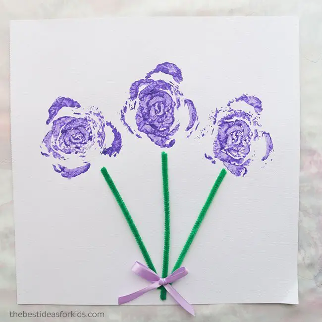 These flowers are made using your toddler’s tiny fingerprints, which makes the craft extra sweet. Dip their fingers into paint and press them onto card to form colorful petals. Add stems and leaves with a paintbrush or marker to complete the picture.