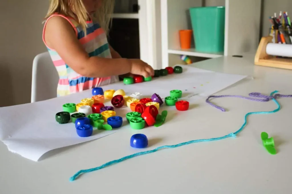 If you have a collection of pouch caps from baby food, this craft is a great way to reuse them. Give your toddler a piece of ribbon or string and let them thread the colorful caps to make necklaces or hanging decorations.