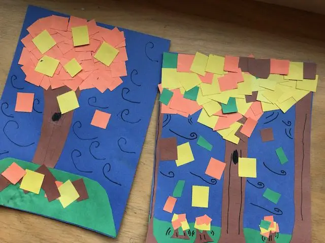 This craft celebrates autumn in a creative way. Cut small squares from colored card in seasonal shades like red, orange, and yellow. Draw or print a simple tree outline on paper, then let your toddler glue the squares onto the branches to form leaves.