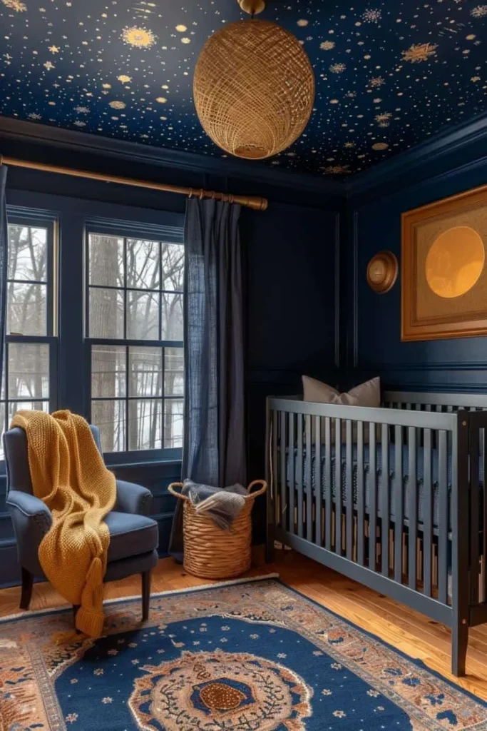 Transform the ceiling into a dreamy night sky. Tiny golden stars painted across deep navy walls create a magical, celestial space. With matching furniture and accents, your baby will have the sweetest bedtime view above their crib.