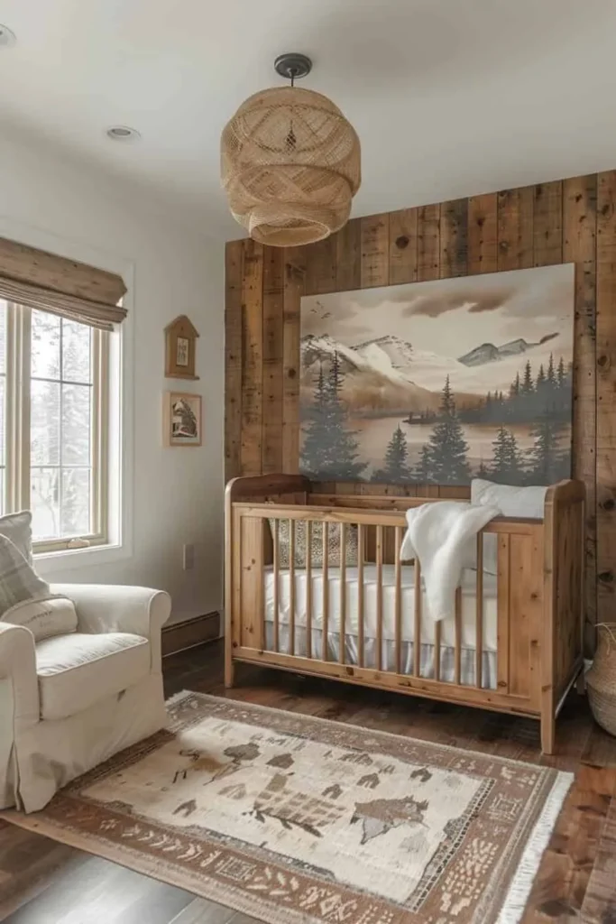Turn the nursery into a grand adventure with a sweeping mountain mural and woodsy furniture. The mix of rugged peaks and natural textures creates a nursery that feels adventurous yet warm and safe.