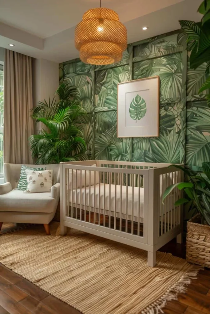 Blend sleek modern style with touches of greenery for a nursery that feels fresh and contemporary. Jungle plants and natural textures balance beautifully with urban-inspired accents, giving the space a playful yet sophisticated vibe.