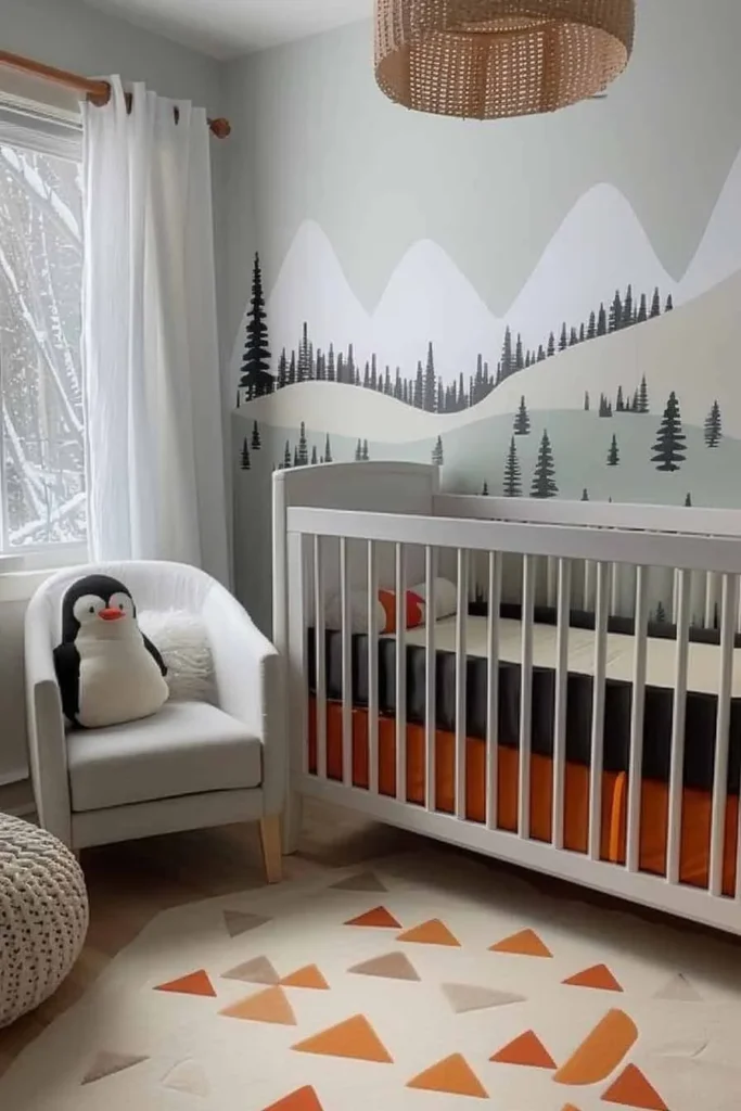 Create a cozy winter wonderland with an arctic mural on the wall and soft plush penguin toys throughout the room. Pair it with warm textures to give your baby a snug little hideaway that feels both cool and comforting.