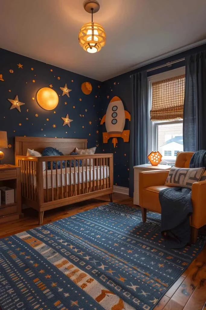 Inspire dreams of space travel with a rocket-themed nursery. Stellar wall motifs, a moon-shaped sconce, and a rocket decal set against shades of blue around a wooden crib make the room feel ready for blastoff into bedtime.