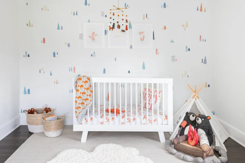 Bring the outdoors in with a camping-inspired nursery. Woodland wallpaper, a colorful mobile, fox-themed accents, and even a little camping play set for when your baby gets older make this space fun and adventurous. Rope baskets are perfect for storing blankets and toys while blending in with the décor.