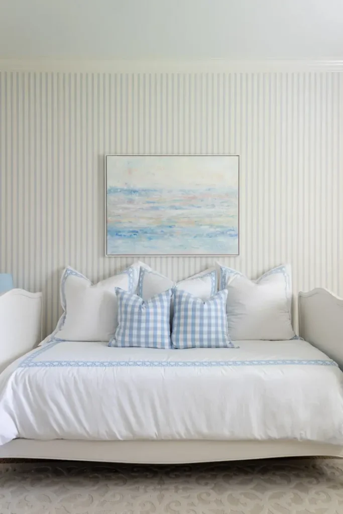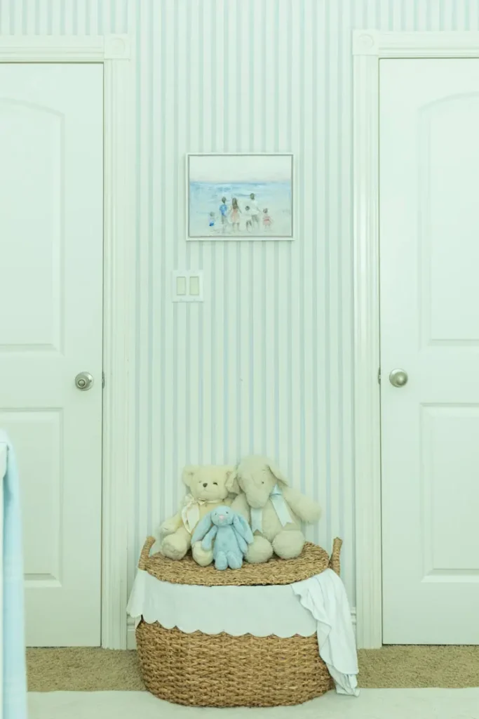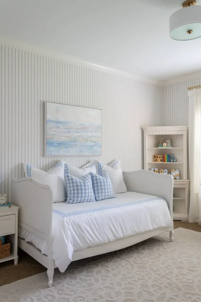 Not every nursery has to be filled with bright colors and patterns. A minimalist approach can feel just as welcoming. Clean lines, open space, and a simple blue-and-white palette create a modern, airy nursery that focuses on calm simplicity while still being stylish.