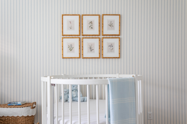 Choose artwork that will grow with your child. Abstract pieces in soft colors bring beauty to the space now and can stay on the walls for years to come. Personal touches like a family-inspired painting or a gallery wall of botanical prints above the crib make the room feel special and unique.