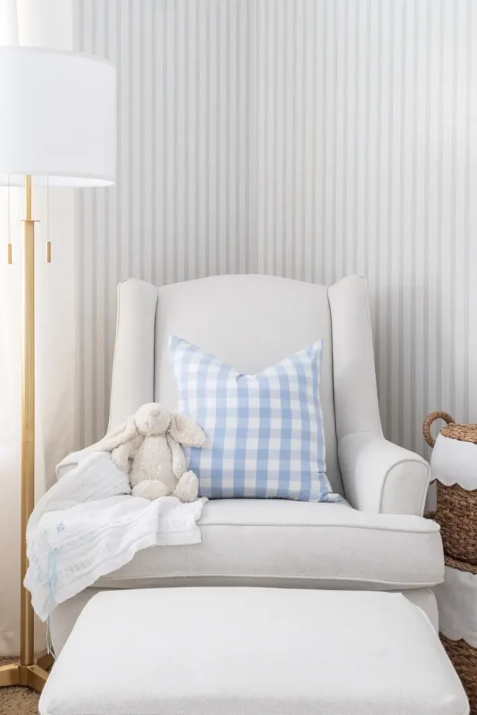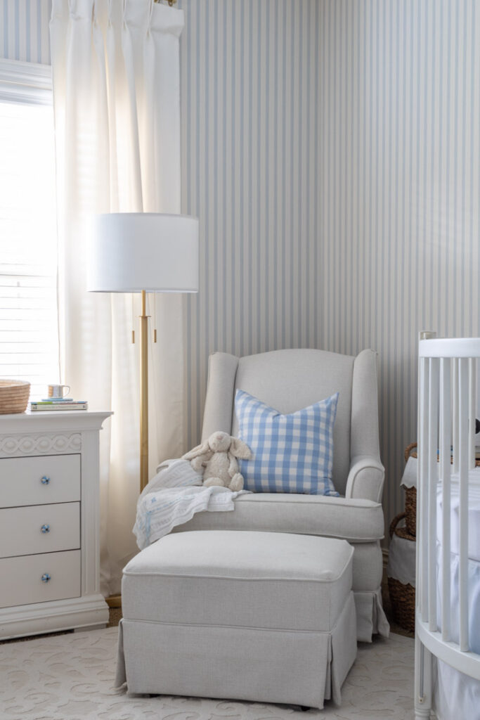 A glider is one of the most important pieces in a nursery. Look for one that glides smoothly and quietly, has supportive cushions, and is made with durable, easy-to-clean fabric. Pair it with an ottoman to make long nights of rocking or nursing more comfortable.