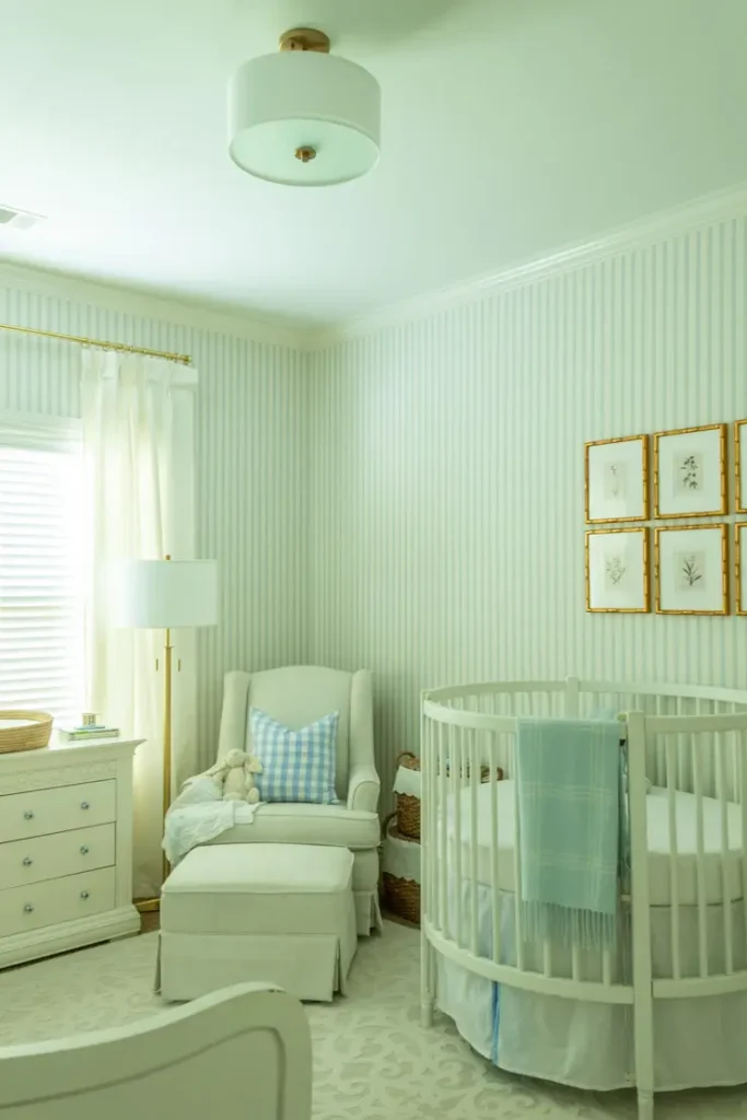 A timeless choice for baby boy nurseries is a classic blue-and-white palette. Soft stripes or patterned wallpaper in these shades feel polished and serene. Pair the look with woven baskets for toy and blanket storage, plus natural accents like wooden toys and colorful books to keep things playful.