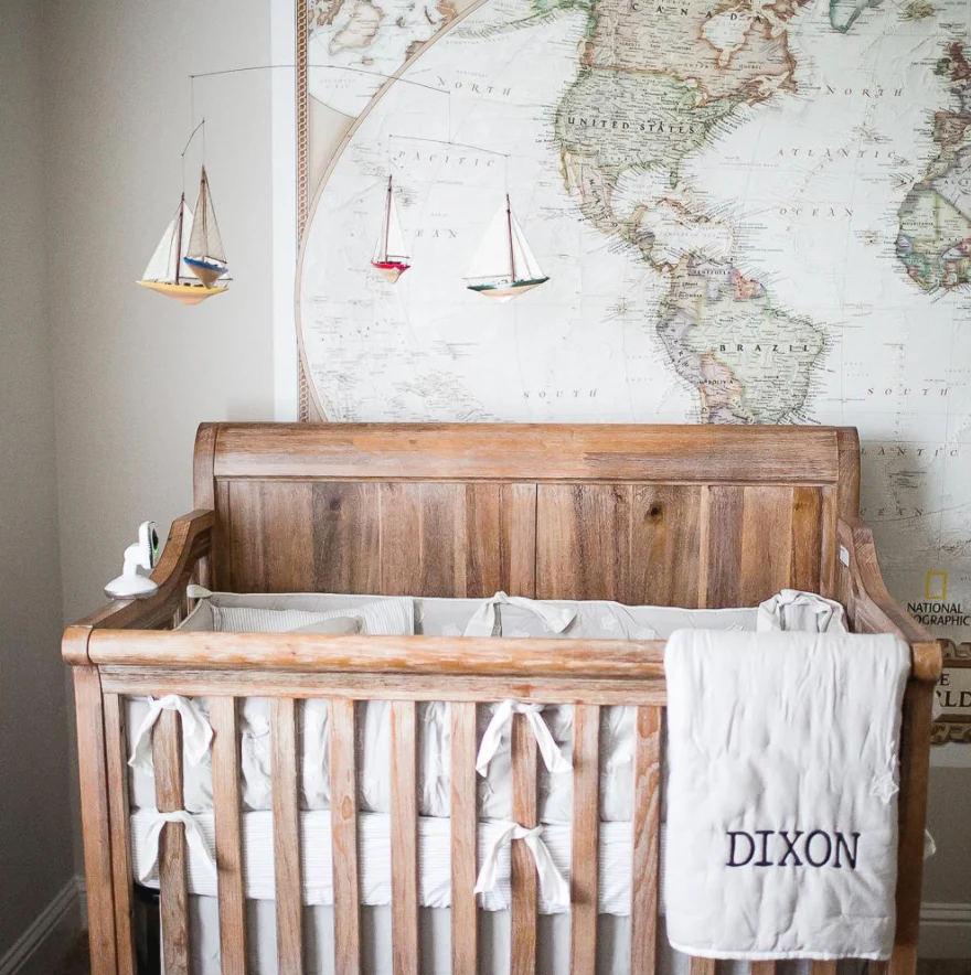 Give your baby boy’s room an adventurous twist with a travel theme. Pair a rustic crib with a world map poster on the wall, then add a boat mobile overhead to complete the look. It’s simple, timeless, and inspiring.