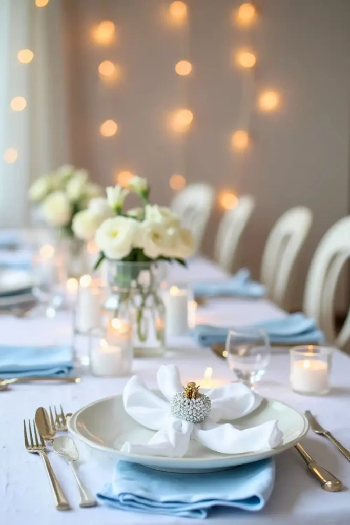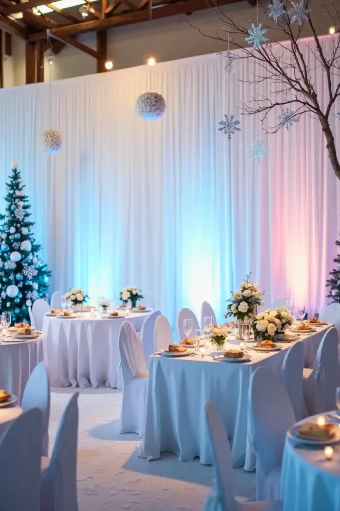 Keep things elegant with a color palette of white, silver, and soft blue. Dress your tables in shimmering silver cloths, use crisp white napkins, and add pale blue balloons or candles for a frosty, dreamy effect.