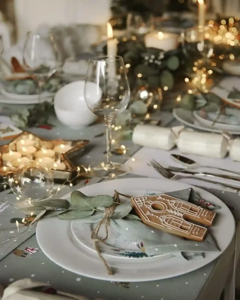 Decorate your table with tiny candles, string lights, eucalyptus sprigs, and gingerbread cookies for an inviting atmosphere that makes guests want to stay and sip cocoa all day.