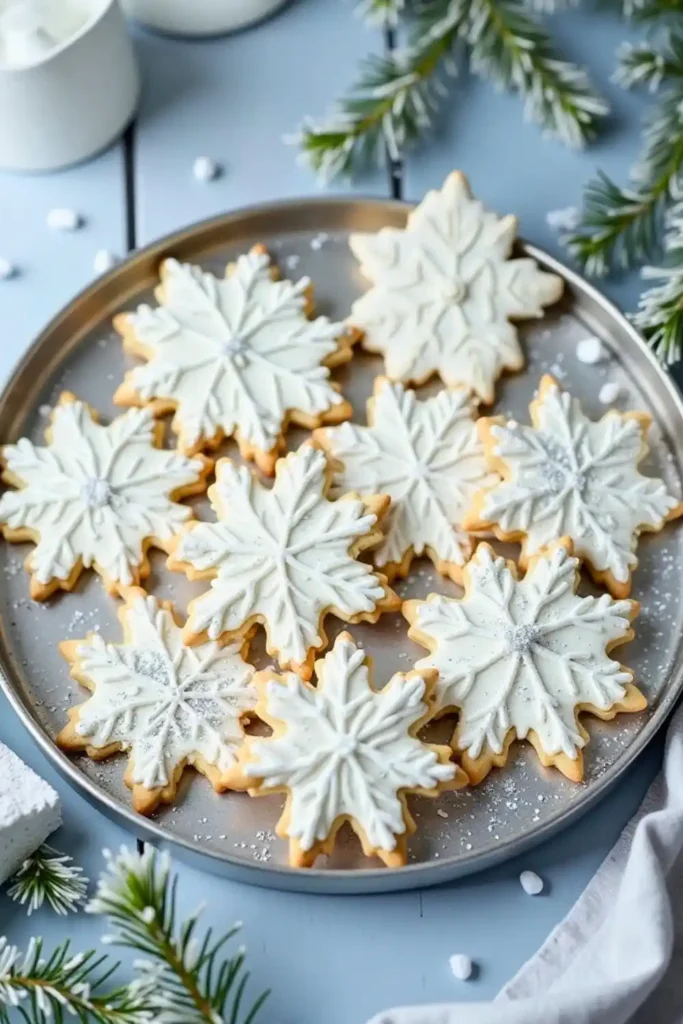 Delight guests with sugar cookies shaped like snowflakes, decorated with white icing and a touch of edible glitter. Arrange them on a silver tray or a rustic wooden board for a charming display.