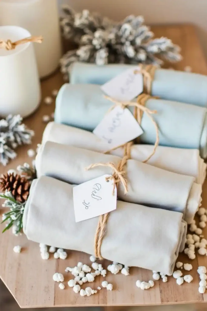 Give your guests a thoughtful favor they’ll actually use—a soft mini blanket or fleece throw. Roll each one neatly, tie it with twine or ribbon, and attach a small thank-you tag.