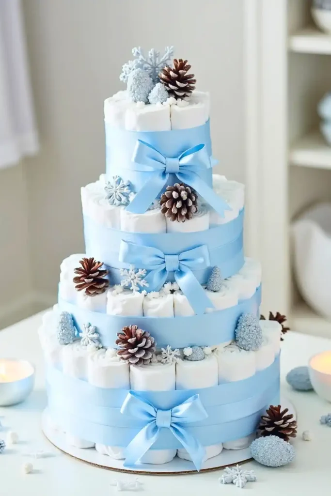 A winter-themed diaper cake makes a lovely centerpiece that’s both practical and beautiful. Stack diapers in tiers and wrap them with blue and white ribbons.
