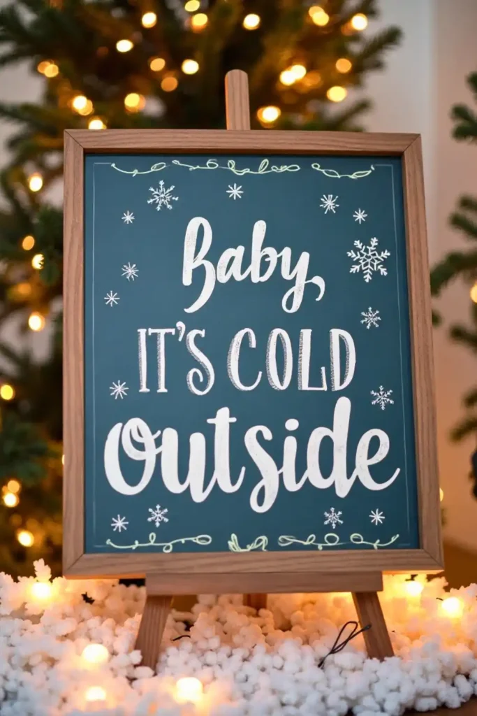 Welcome your guests with a pretty “Baby It’s Cold Outside” sign that sets the mood right away. Use a rustic wooden frame or chalkboard for a cozy, farmhouse touch, or go with a sleek frosted acrylic sign for something more modern.