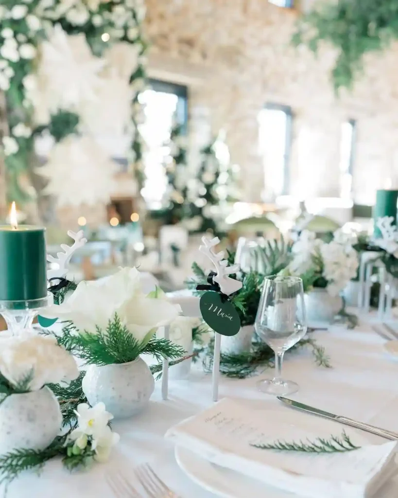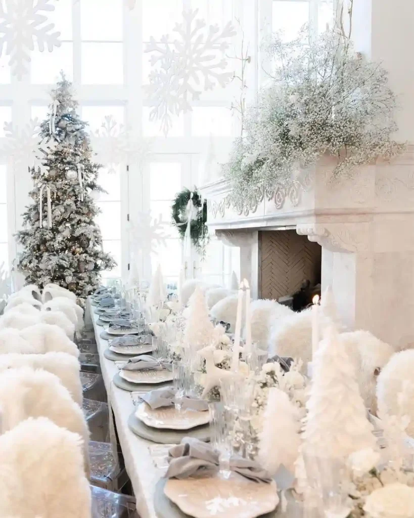 Hang metallic or paper snowflakes and sprinkle artificial snow or cotton at the bottom to complete the cozy snowy scene. It’s the perfect way to set the tone and make your guests feel like they’ve stepped into a magical winter dream.