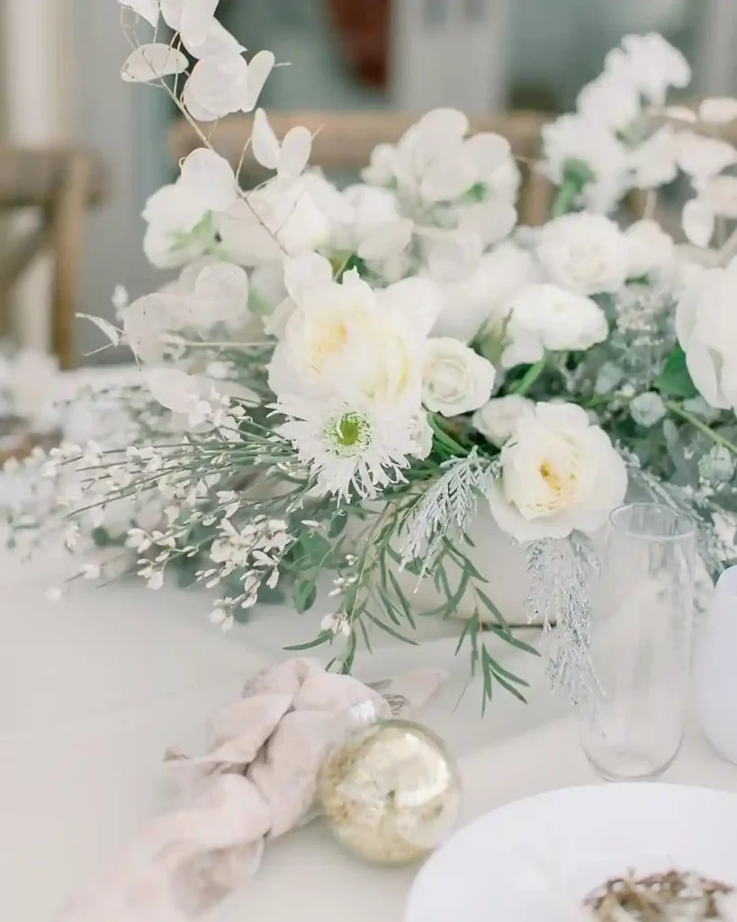 White florals bring a graceful touch to a winter baby shower. Pair them with greenery, soft blue tones, or blush accents for a fresh seasonal look.