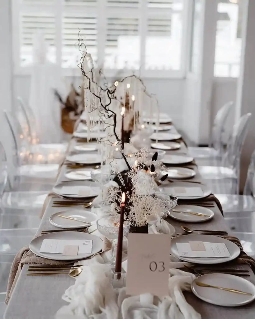 Pine paired with ivory is the ultimate minimalist winter combo. Think fresh pine garlands running down the center of your table with ivory linens, candles, and simple tableware.