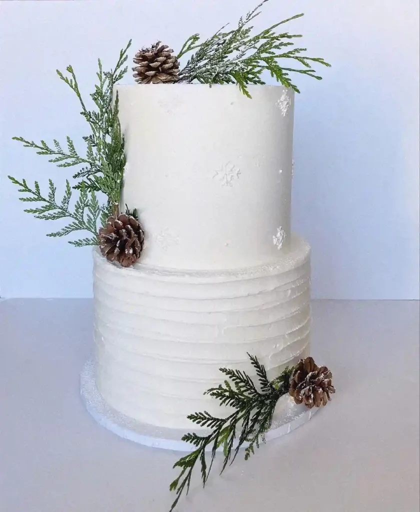 A white frosted cake with pinecones, fir sprigs, and subtle snowflake details makes a stunning centerpiece for your dessert table. The simplicity of the design keeps it elegant while still feeling festive and wintry.