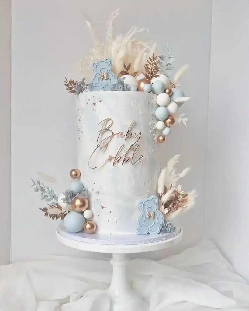 Combine baby blue and gold for a sophisticated cake that feels both seasonal and celebratory. Add delicate winter foliage, snowflakes, or even a tiny teddy bear topper for a playful touch.