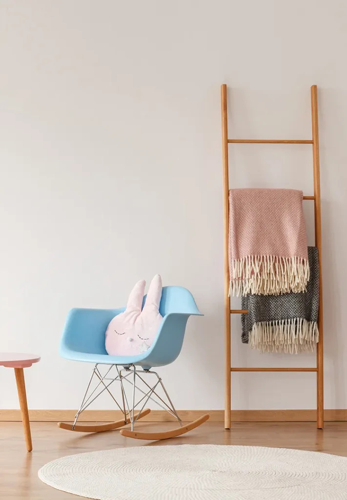 Instead of hiding everything away, display some of your favorite baby blankets or soft towels. An etagere, a storage ladder, or even a classic towel rack works beautifully for this. It keeps those everyday essentials within reach while giving the nursery a little extra charm.