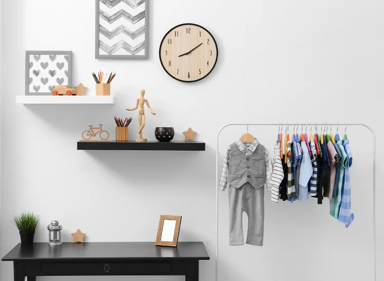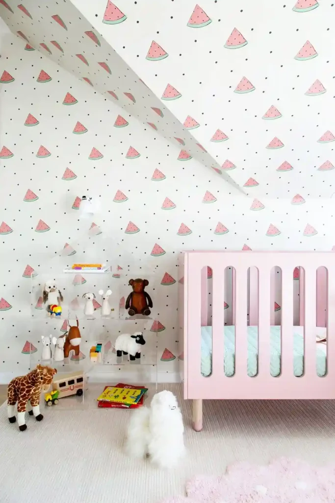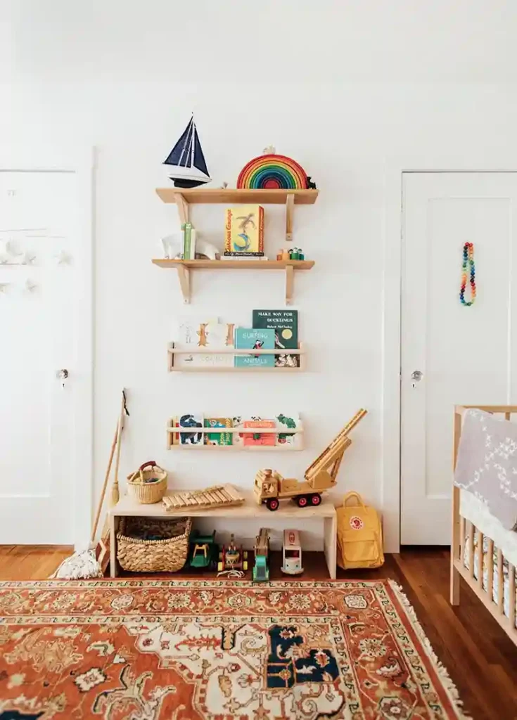If you’re planning to use floating shelves, think about baby proofing them. A simple horizontal bar across the front helps keep books and decor from sliding off. It’s a small detail that makes a big difference in safety, and the shelves still add brightness and personality to the walls.