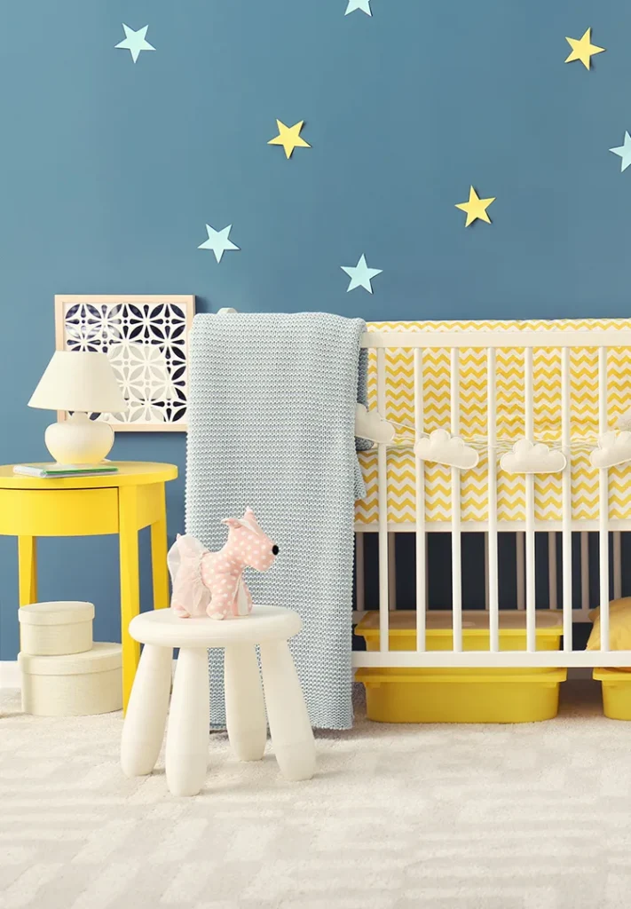 When choosing side tables, look for designs with more than one level. A tiered table gives you space for a lamp, a book, and still has room underneath for baskets or extra storage. Pair them with wall sconces instead of table lamps to keep tabletops clear. Brightly colored fixtures can also double as decor, adding a cheerful touch to the nursery.