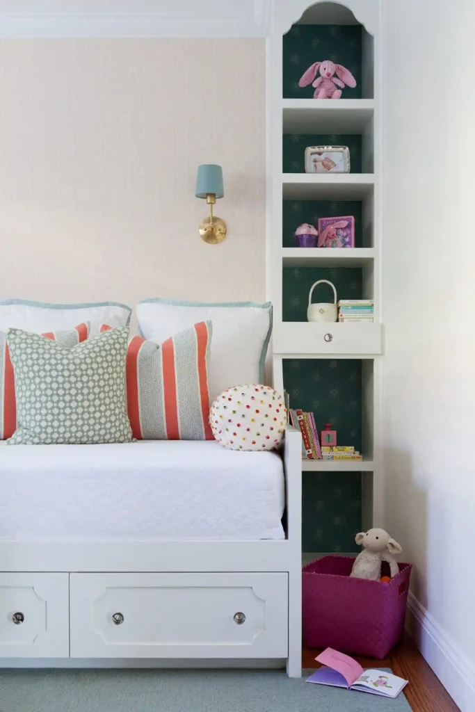 Why not make storage part of the fun? Choose shelving or bins that double as play pieces, like a unit shaped like a dollhouse. It keeps toys and books neat while also adding a playful touch to the room. When storage feels like part of the decor, cleanup is easier and more enjoyable.