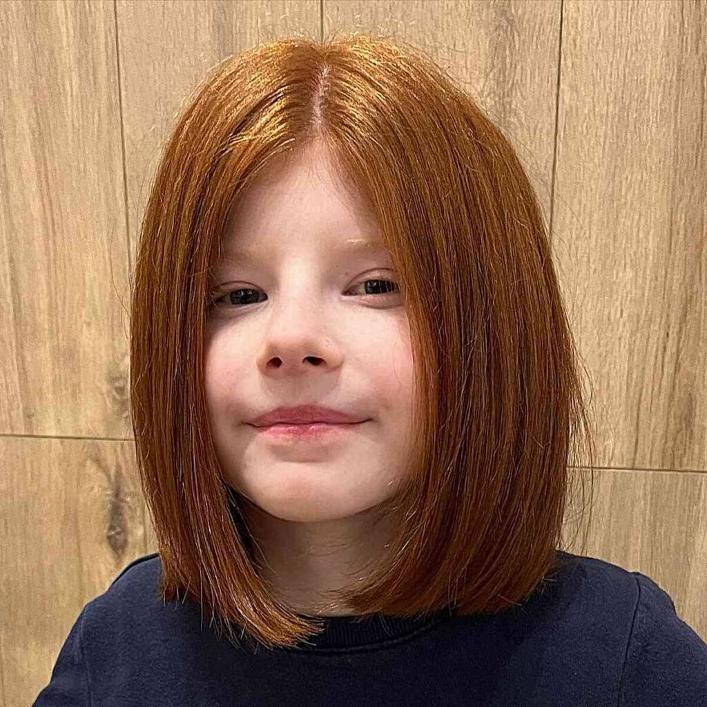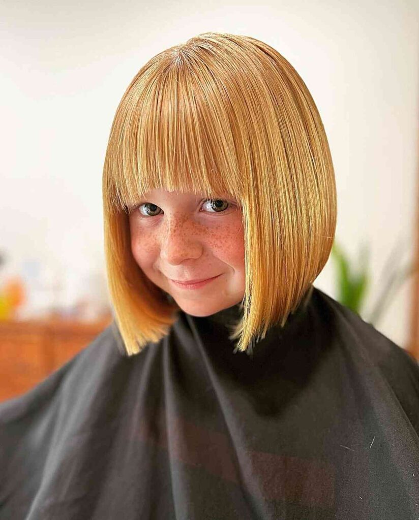 If you are looking for a kid’s cut that is easy to manage at home, go for a straight blunt bob with short bangs. This super sharp crop can help keep your little one’s mane tangle‑free and stylish.