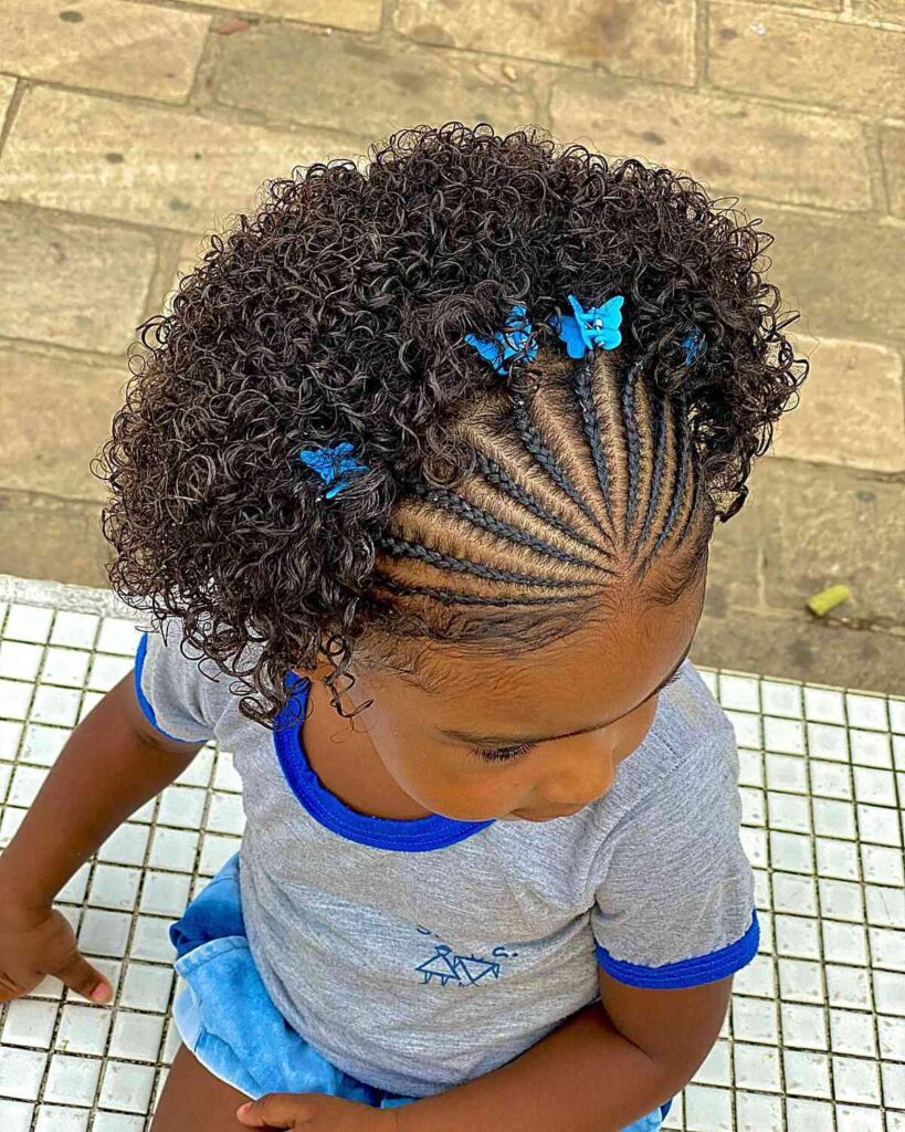 For parents looking to embrace their little girl’s hair texture, adorable cornrows with curls offer a great way to celebrate their natural curl pattern and look cute.