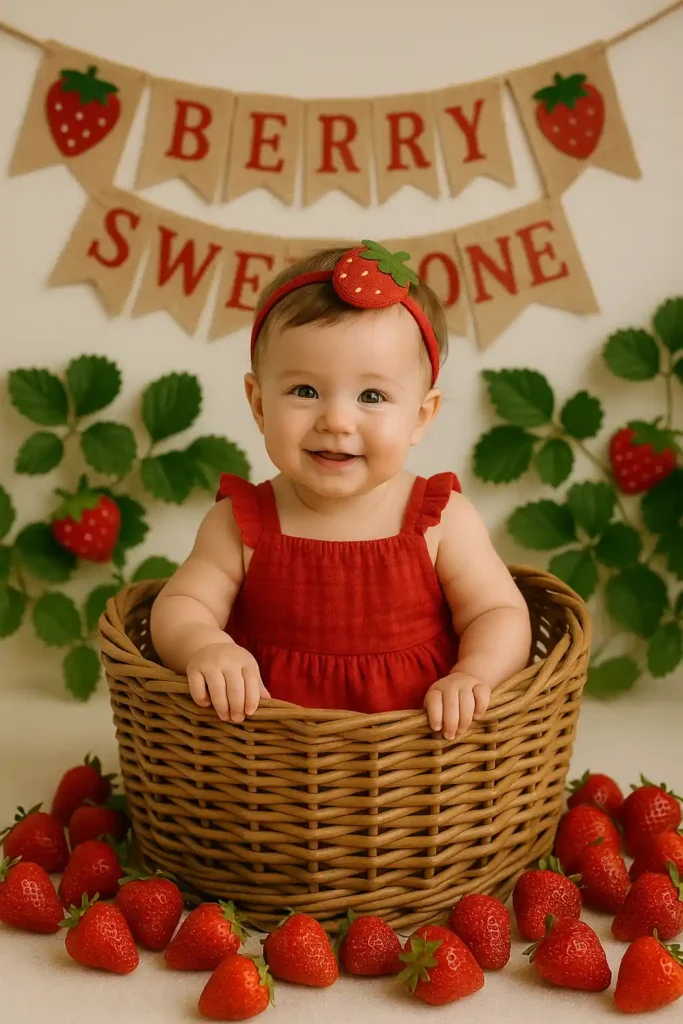 Nothing captures the sweetness of a first birthday like your baby sitting in a cozy wicker basket surrounded by fresh strawberries. The soft colors, natural light, and warm smile make this setup feel simple yet magical.