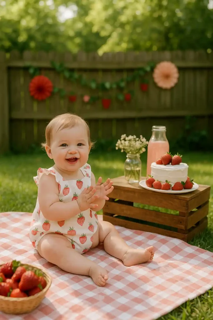A simple wicker basket filled with strawberries and a smiling baby is pure magic. It’s sweet, rustic, and always a favorite shot for moms.