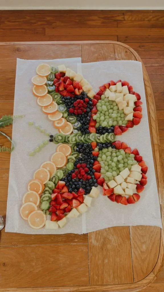This colorful butterfly fruit platter is such a fun and healthy way to bring your theme to life. Slices of oranges, kiwis, strawberries, grapes, blueberries, and pineapple are arranged to form beautiful wings. The variety of colors makes it a showstopper for your party table and a refreshing treat everyone can enjoy.