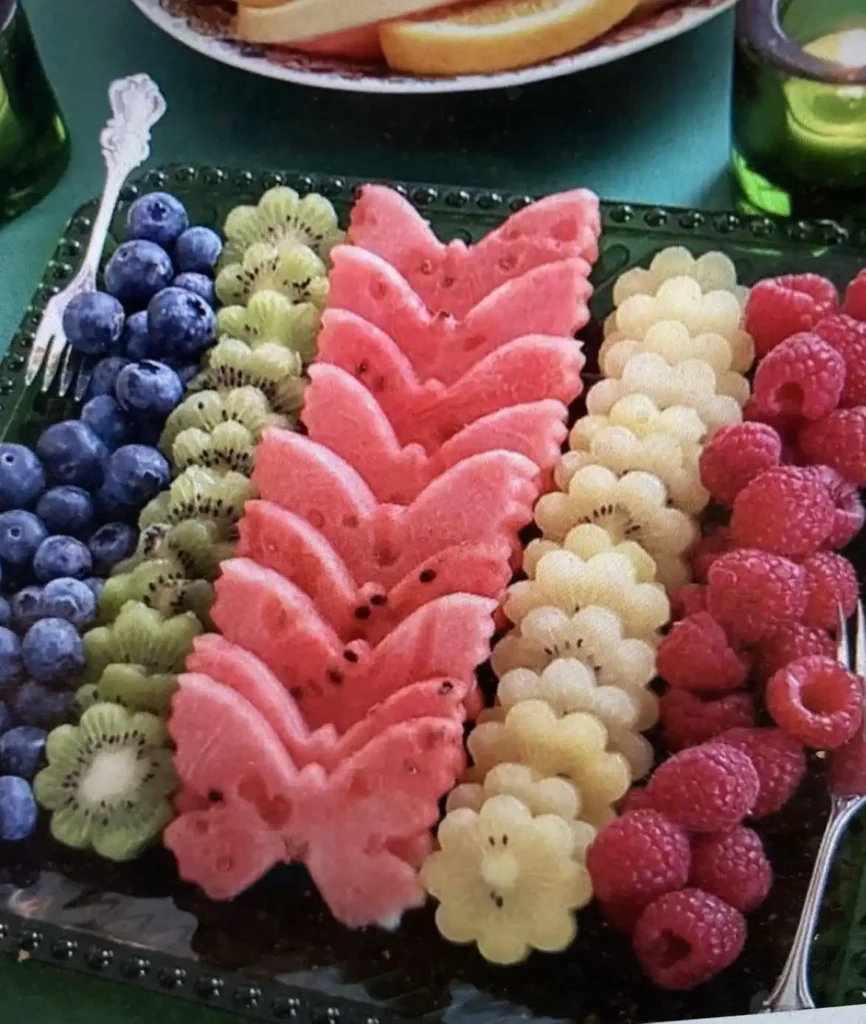 This tray brings a sweet and juicy twist to your fruit display. Using a butterfly cookie cutter, slice watermelon into butterfly shapes and line them up with other colorful fruits like kiwi, pineapple, blueberries, and raspberries. It’s an easy way to add a pop of color while keeping things fresh and fun.