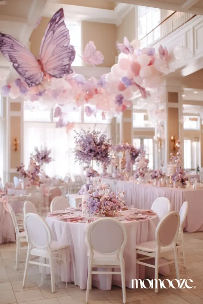 This butterfly baby shower idea features a stunning pastel setup with whimsical lavender centerpieces and delicate balloon arches. Oversized butterfly decorations floating above the tables create a magical and dreamy atmosphere.