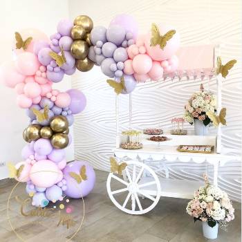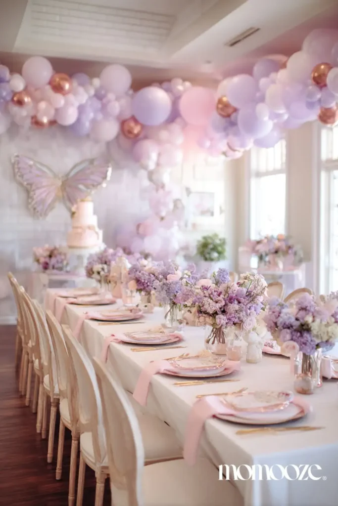 This setup highlights a long party table styled with pink and lavender florals, paired with whimsical balloon garlands and a butterfly backdrop. The rose gold cutlery and soft pastel linens add a chic, modern touch. Perfect for large gatherings, this design balances elegance with playful charm.
