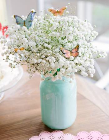 Baby’s breath always feels perfect for a baby shower, but when you add a few 3D butterfly stickers to each bunch, the look becomes even more magical. These delicate bouquets bring just the right amount of whimsy to your setup.