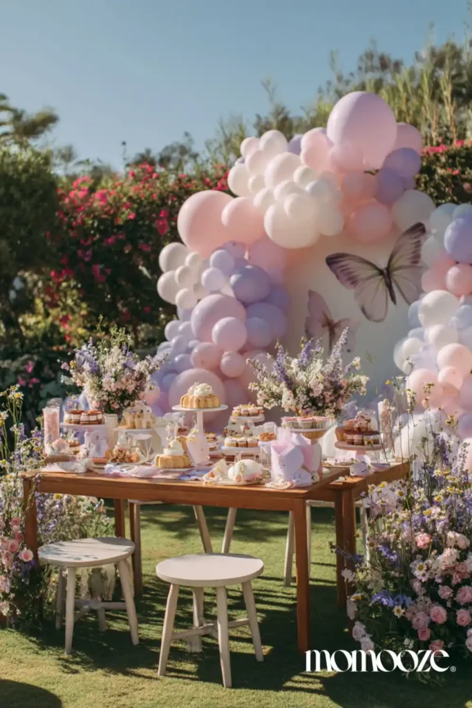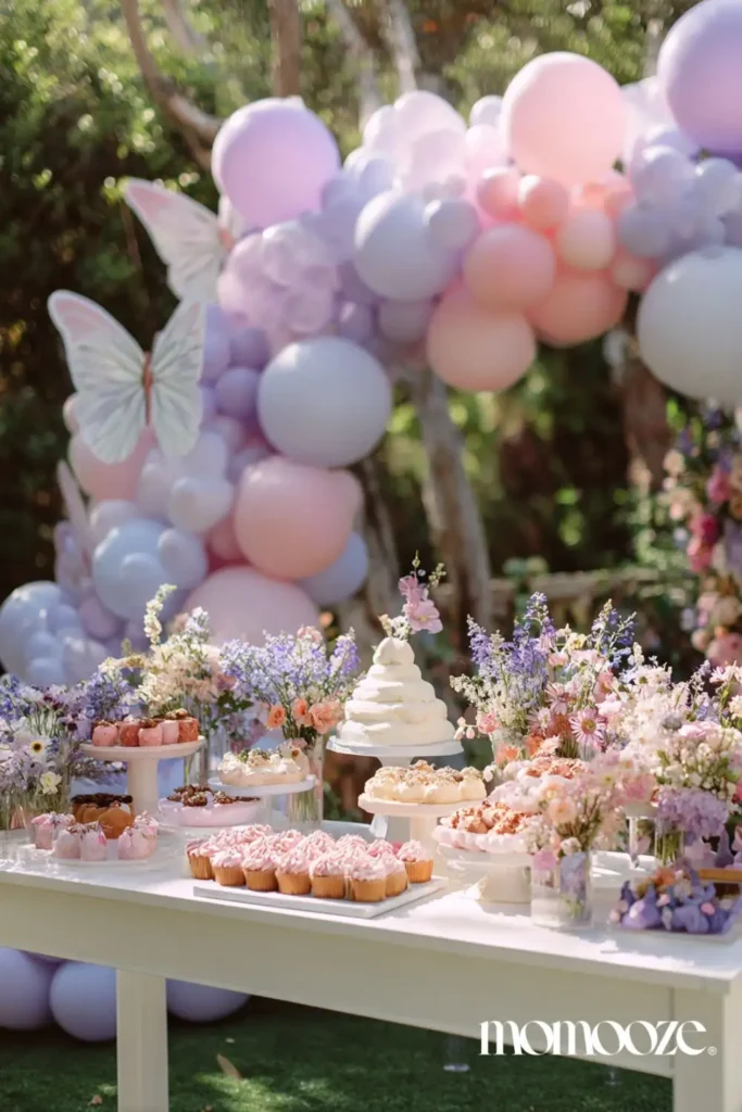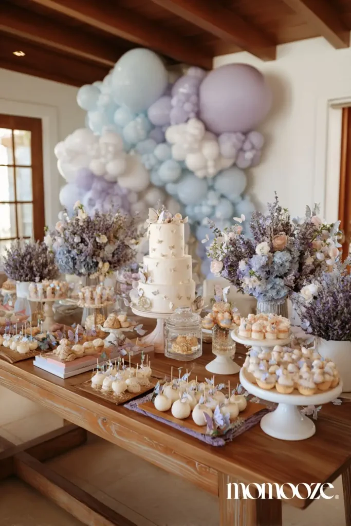 This dessert table brings together pastel cakes, whimsical cupcakes, and lavender wildflowers. The balloon arch with butterfly accents frames the setup perfectly, giving it a fairytale feel. It’s the ideal way to create a focal point that doubles as both décor and a sweet treat station.
