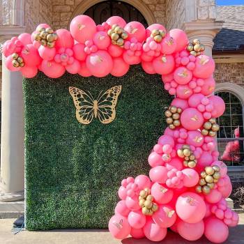 Create a dreamy photo backdrop with pops of pink and gold against a lush green backdrop. It’s the perfect combination of nature-inspired and boho beauty for a butterfly-themed celebration.