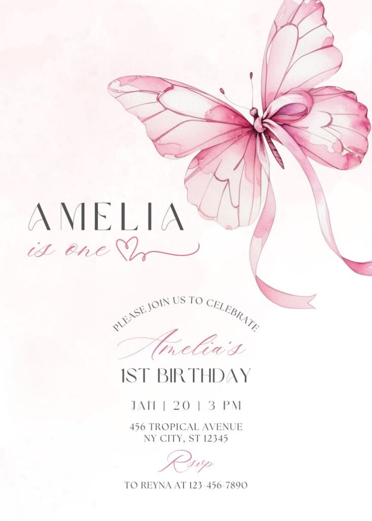Butterfly-themed invitations set the mood right from the start. Soft pinks, purples, or pastels with delicate butterfly artwork feel perfect for a first birthday. I have seen simple printed cards work just as well as digital invites for busy parents. Keep the wording short and sweet so guests know what to expect.