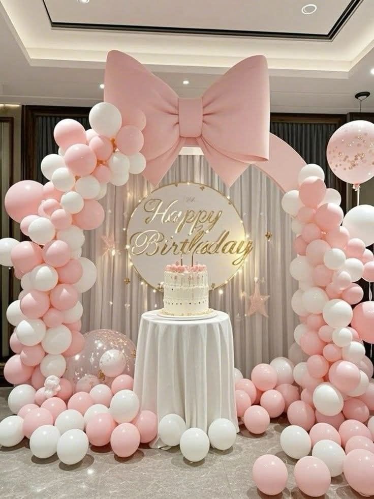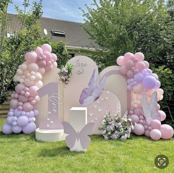 A balloon arch instantly lifts the party space. Soft pink, lavender, and cream balloons with small butterfly accents look beautiful together. I have seen even simple balloon setups look stunning when placed behind the cake table. This is one detail that makes the party feel styled without much effort.