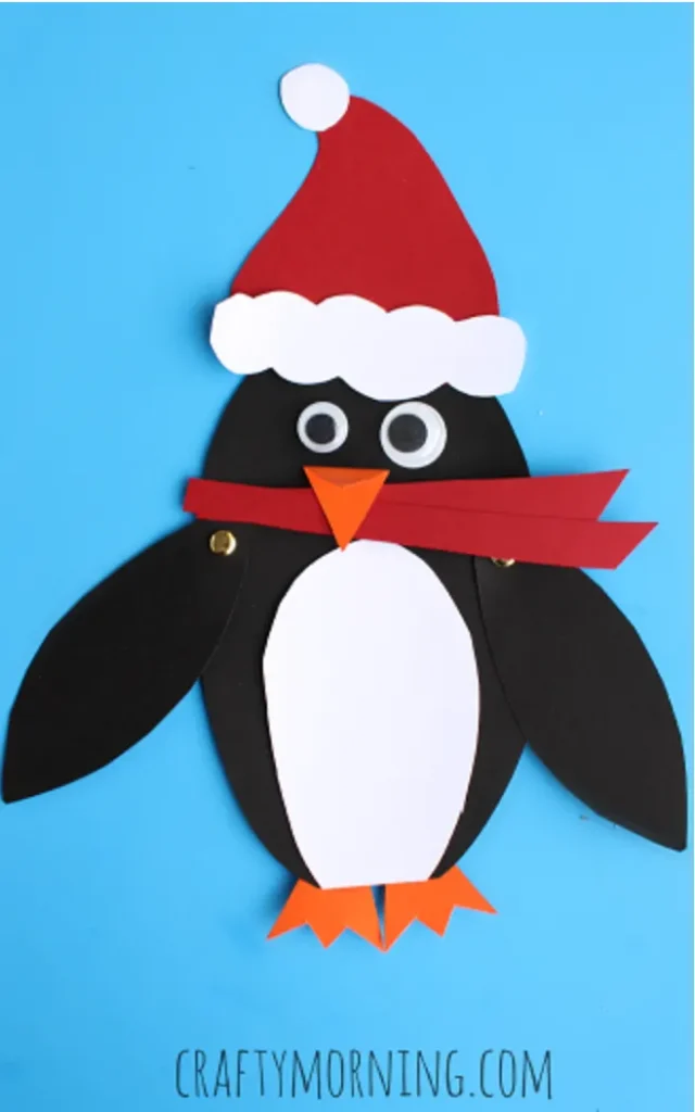 This cute moveable penguin craft is a fun project that brings paper to life. Kids can cut out simple penguin shapes from black, white, and orange paper, then use small brass fasteners or split pins to attach the wings so they can flap.