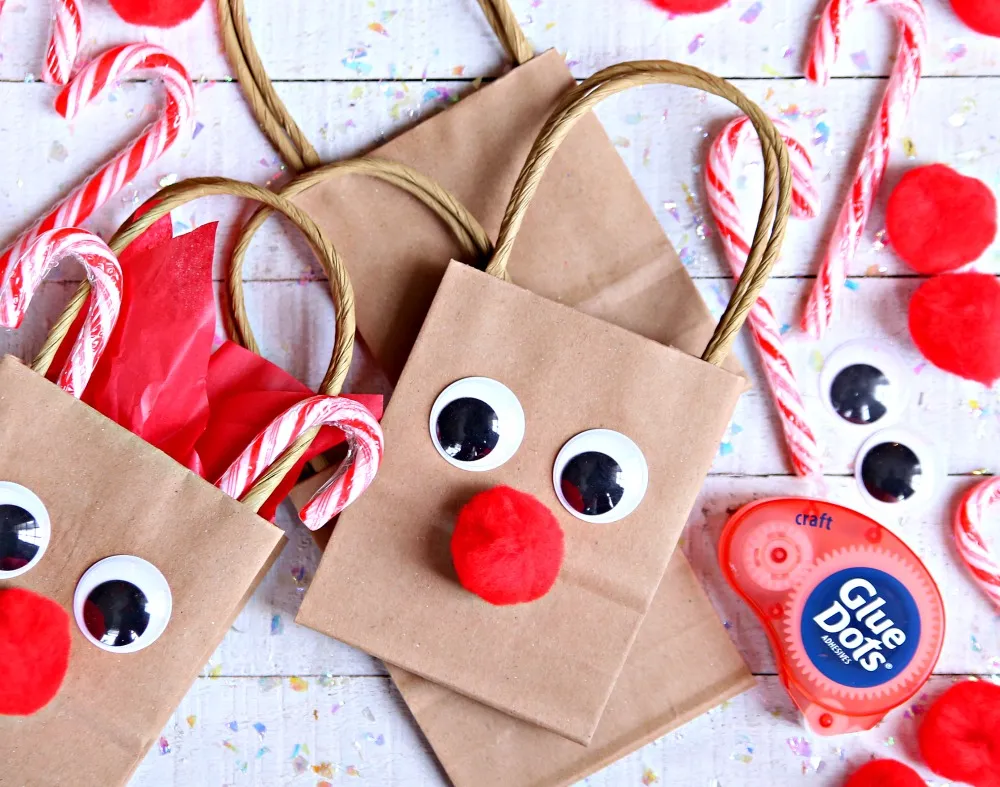 Add a handmade touch to your holiday gift wrapping with these adorable reindeer gift bags. Start with a plain brown paper bag and decorate it with googly eyes, a red pom-pom nose, and paper antlers.
