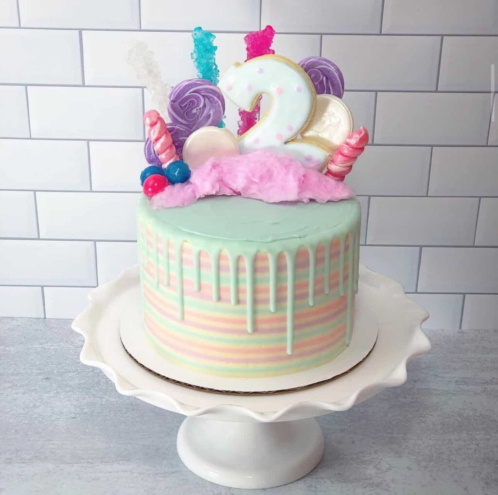 Starting the list off strong, this birthday cake keeps things to a single tier while still making a big impact with its beautiful striped design. It stands out as the only cake using cotton candy and rock candy as decoration, which gives it such a fun and playful look.